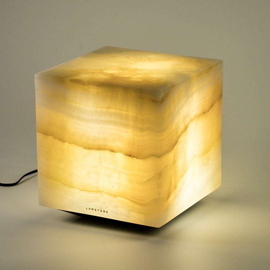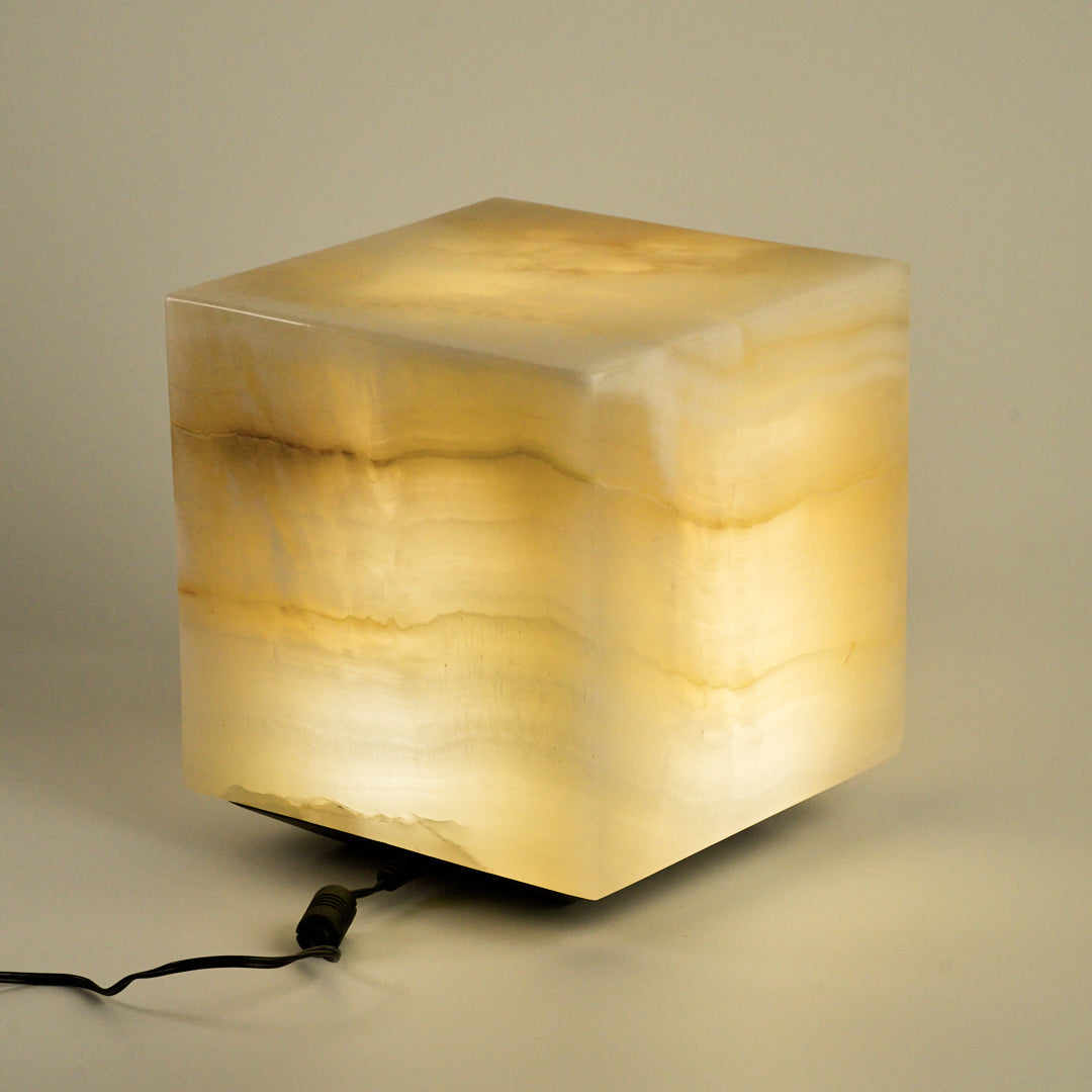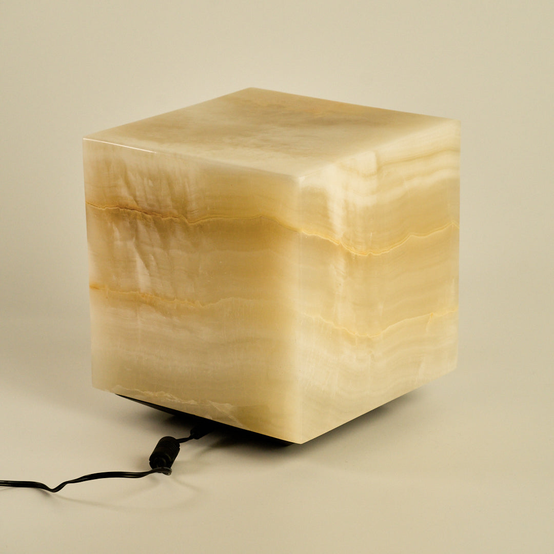 Lighting piece with an elegant and unique design, handmade with natural elements. The main property of this lamp is the onyx marble cube, its transparency and honey tones create a warm and decorative light. Each piece is unique and contains special features.