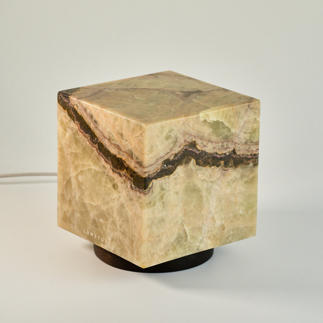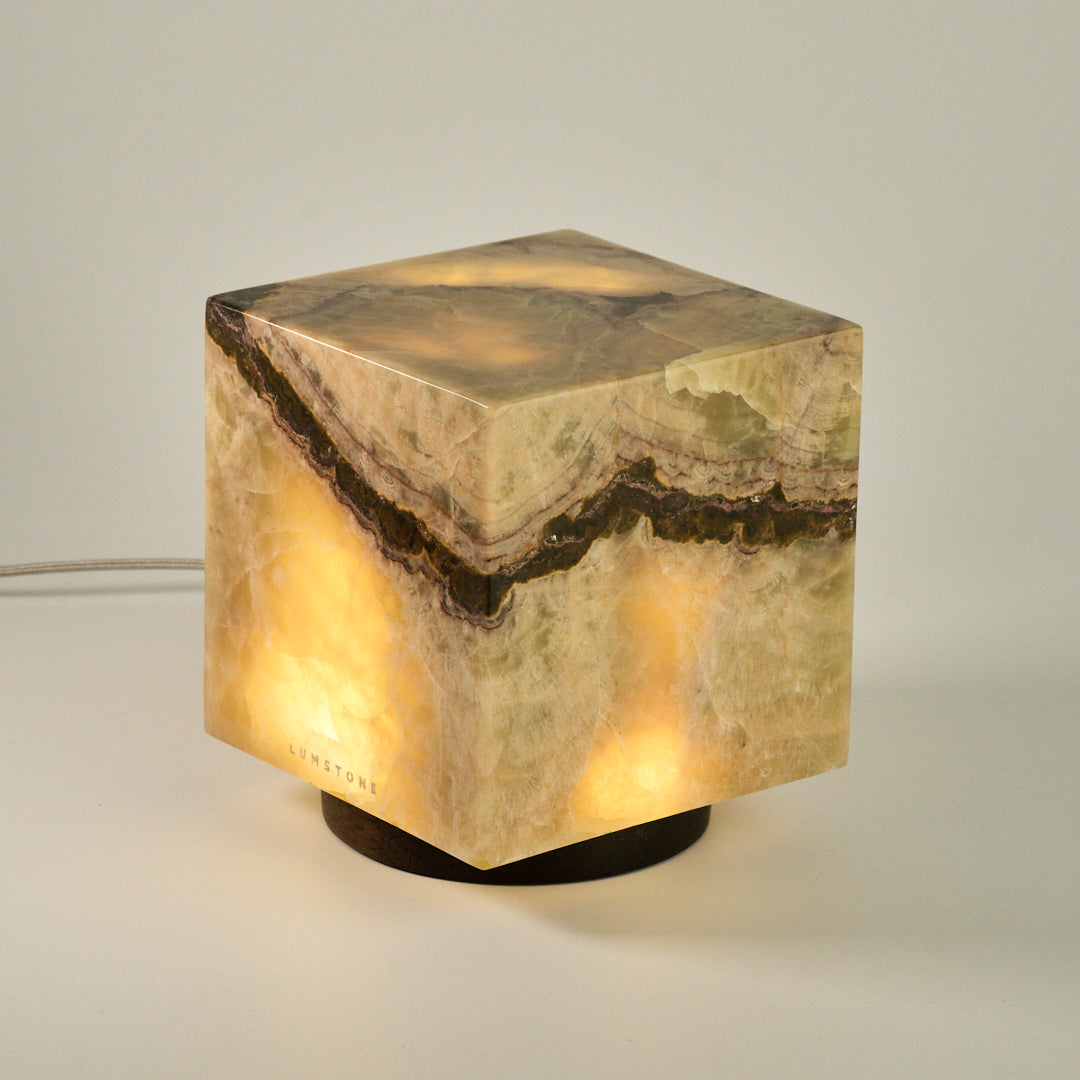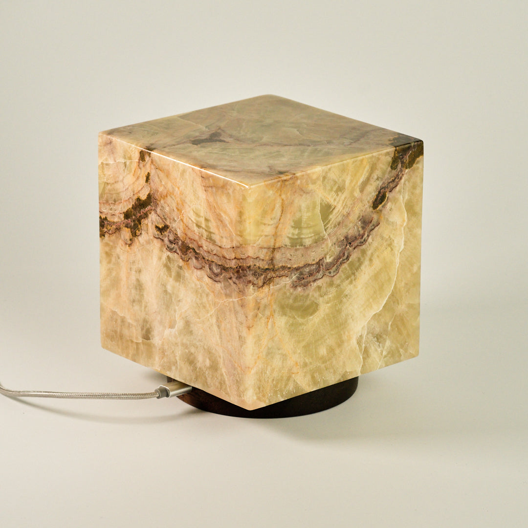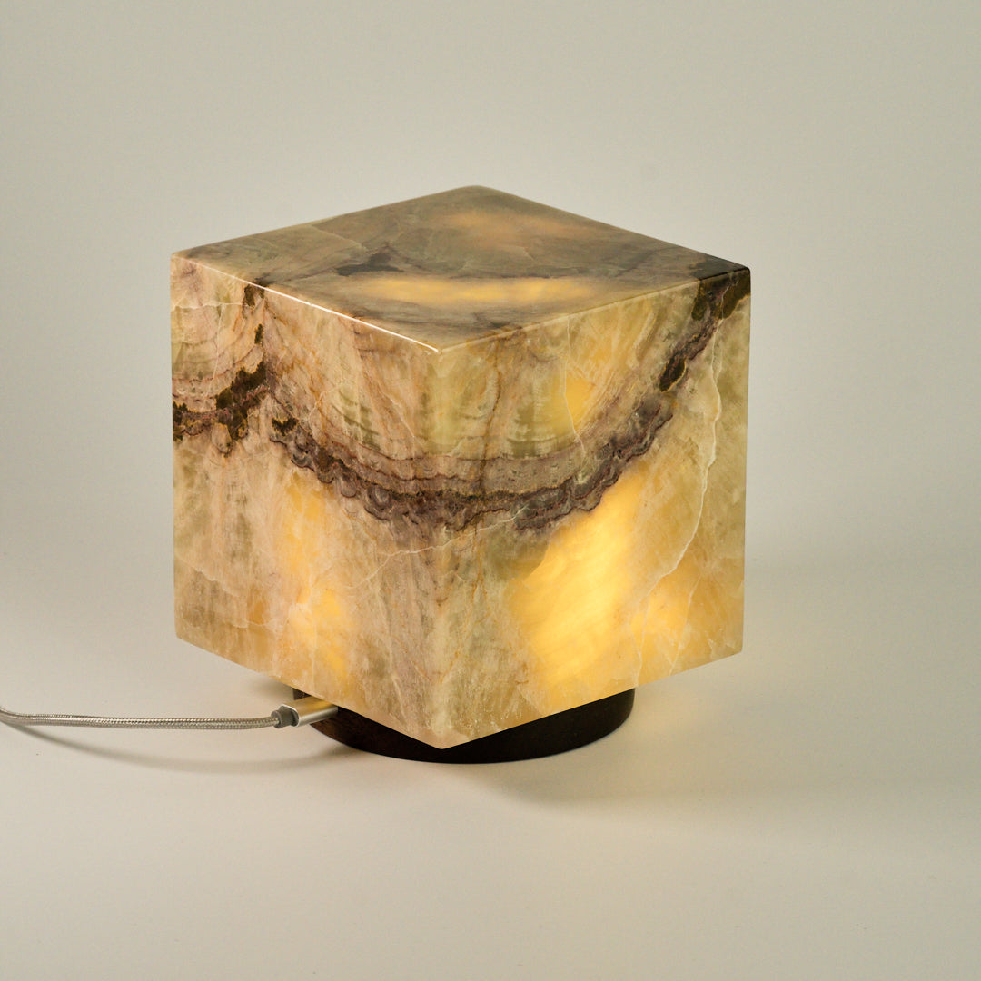 Lighting piece with an elegant and unique design, handmade with natural elements. The main property of this lamp is the onyx marble cube, its transparency and tones allow it to generate a warm and decorative light. Each piece is unique and contains special features.