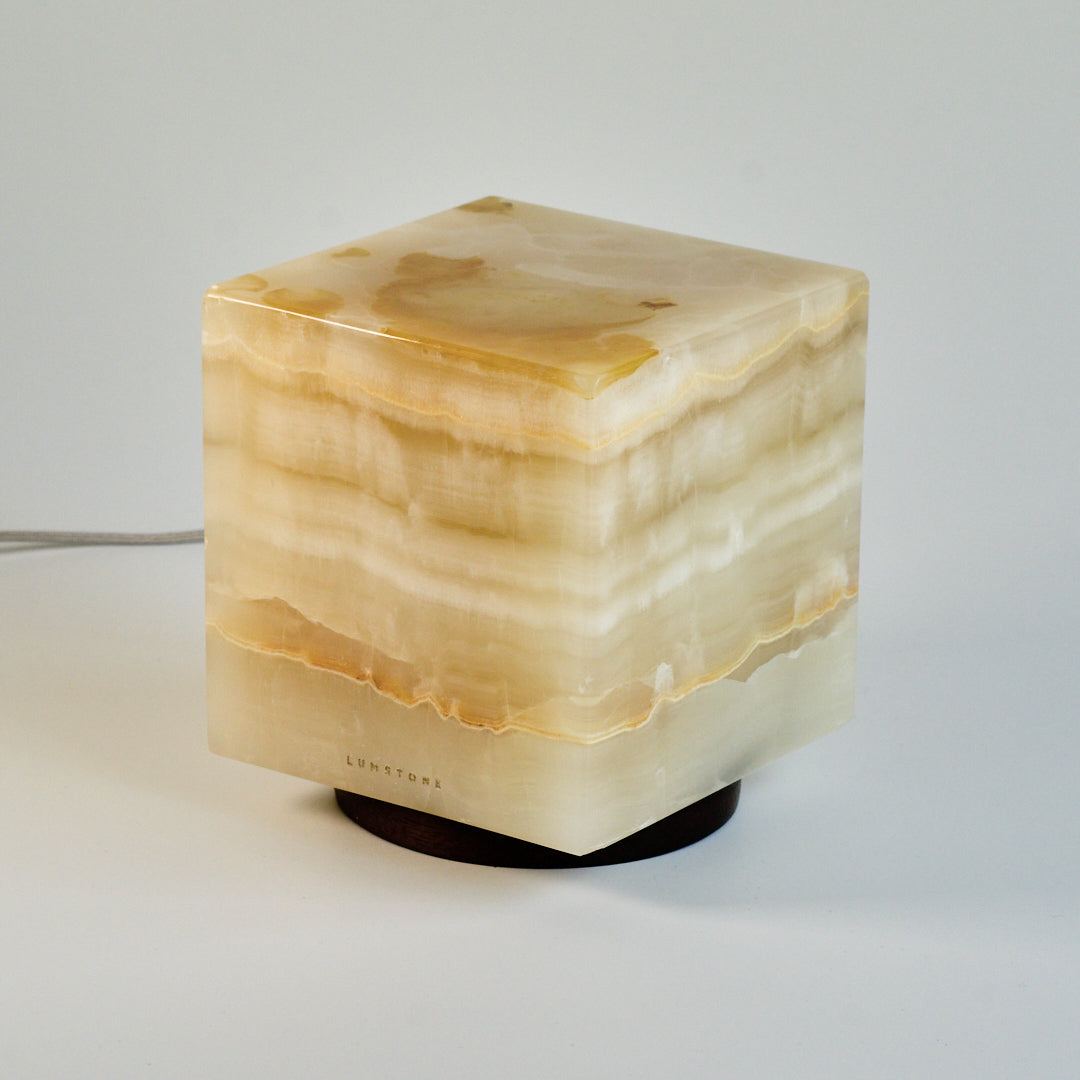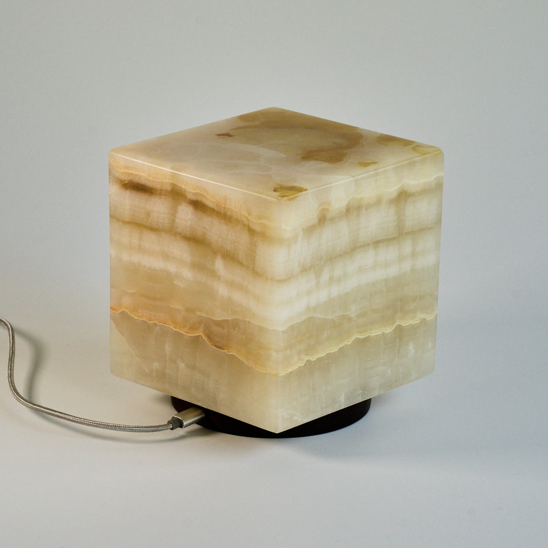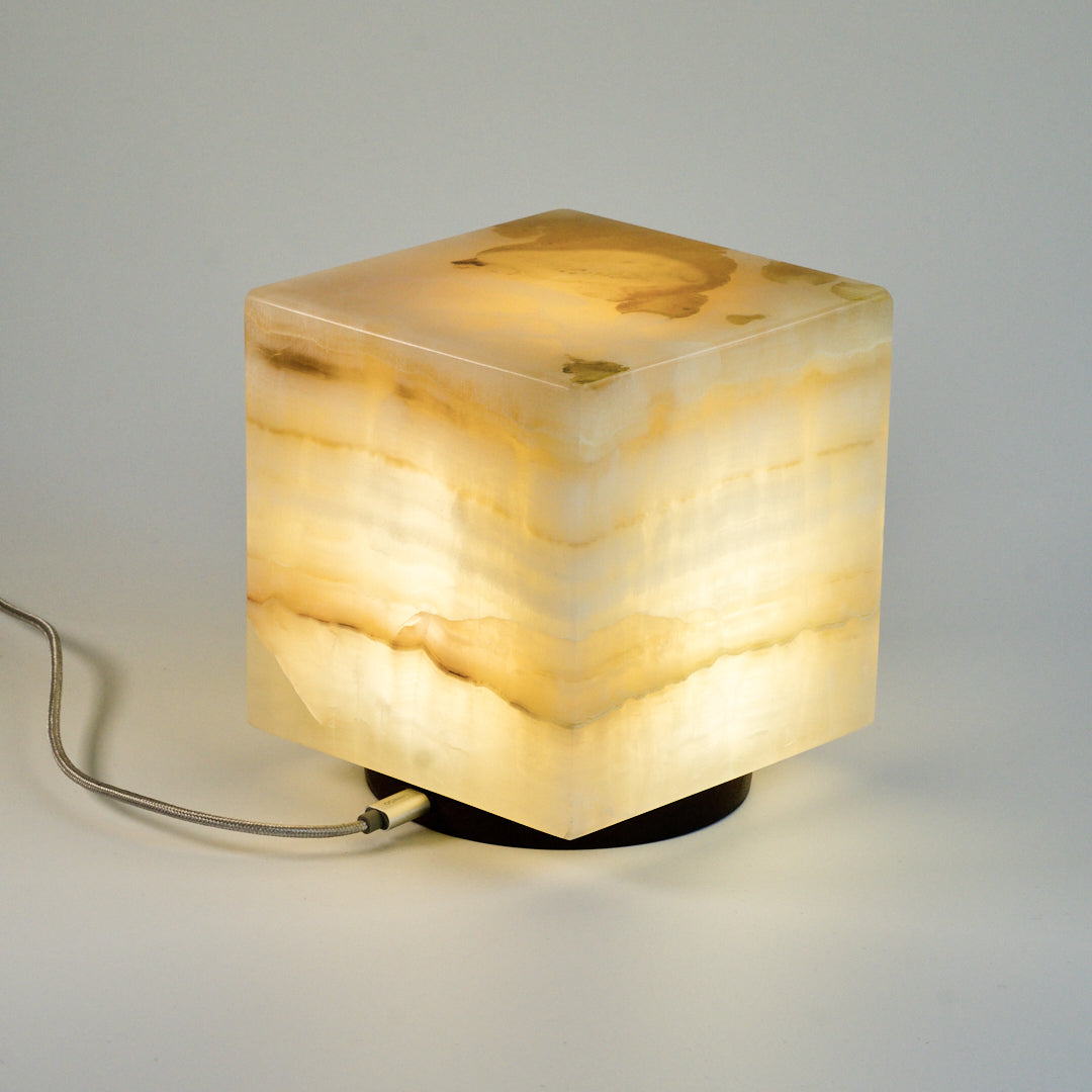 Lighting piece with an elegant and unique design, handmade with natural elements. The main property of this lamp is the onyx marble cube, its transparency and tones allow it to generate a warm and decorative light. Each piece is unique and contains special features.